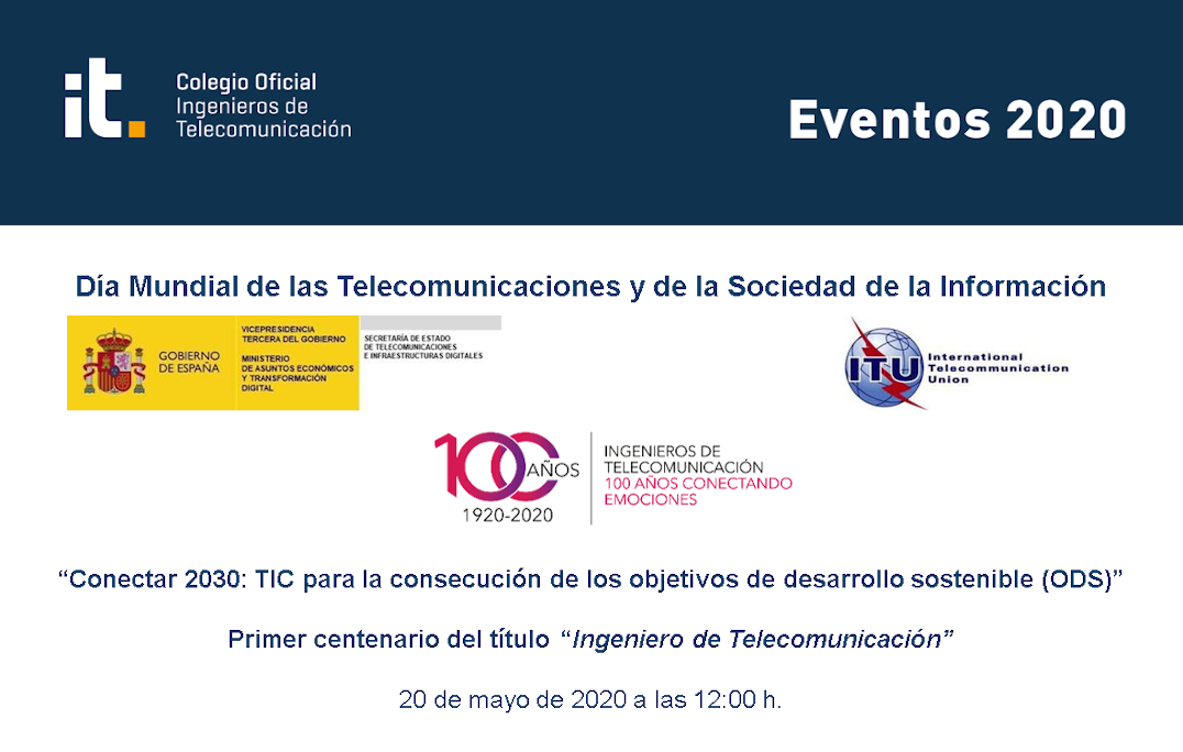 El Colegio Oficial de Ingenieros de Telecomunicación (COIT) te invita al evento virtual de celebración del del Día Mundial de las Telecomunicaciones y de la Sociedad de la Información y Centenario del título de Ingeniero de Telecomunicación, que realizaremos hoy 20 de mayo a las 12:00 horas.