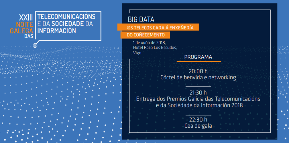 Un año más el Colexio Oficial Enxeñeiros de Telecomunicación Galicia y la Asociación de Enxeñeiros de Telecomunicación de Galicia (COETG/AETG) celebran la XXIII Noite Galega das Telecomunications e da Sociedade da Información 2018, una celebración tradicional anual, que este año lleva por lema "Os telec@s cara á enxeñería do coñecemento" y en el que se pondrá especial énfasis en el desarrollo de BIG DATA como una oportunidad laboral para nuestro colectivo.