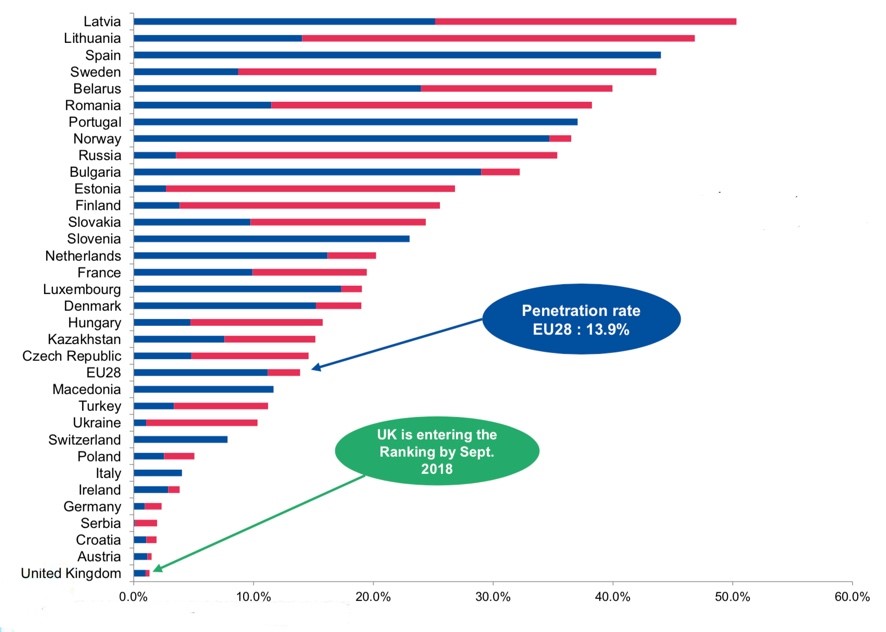 Comparación de la penetración de la fibra óptica en Europa (2018), Fuente: IDATE para el FTTH Council Europe, marzo de 2019.