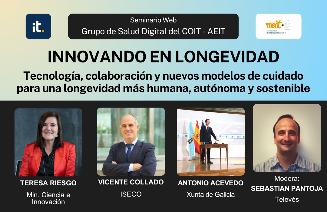 El Grupo de Trabajo E-salud del COIT, junto con el programa de mentorización del COIT (Ment-IT), organizan el webinar “Innovando en longevidad”, una cita imprescindible para los profesionales de los sectores sanitario y de las telecomunicaciones.